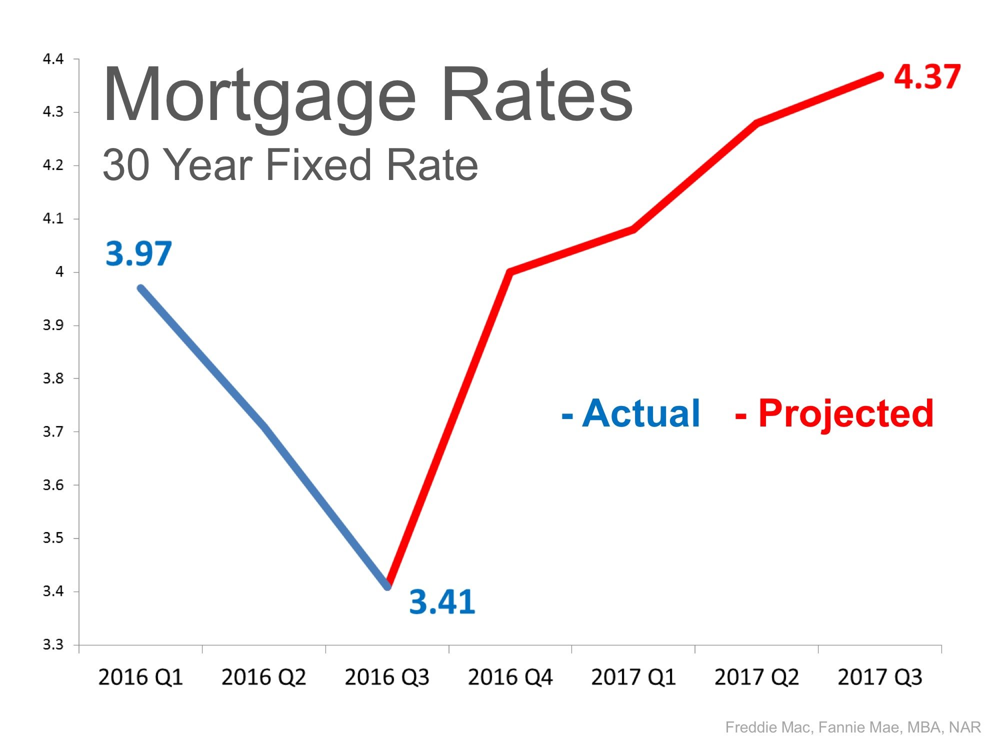 The Mortgage Bankers Association (MBA), the National Association of Realtors, Fannie Mae and Freddie Mac have all projected that mortgage interest rates will increase over the next twelve months as you can see in the chart below: